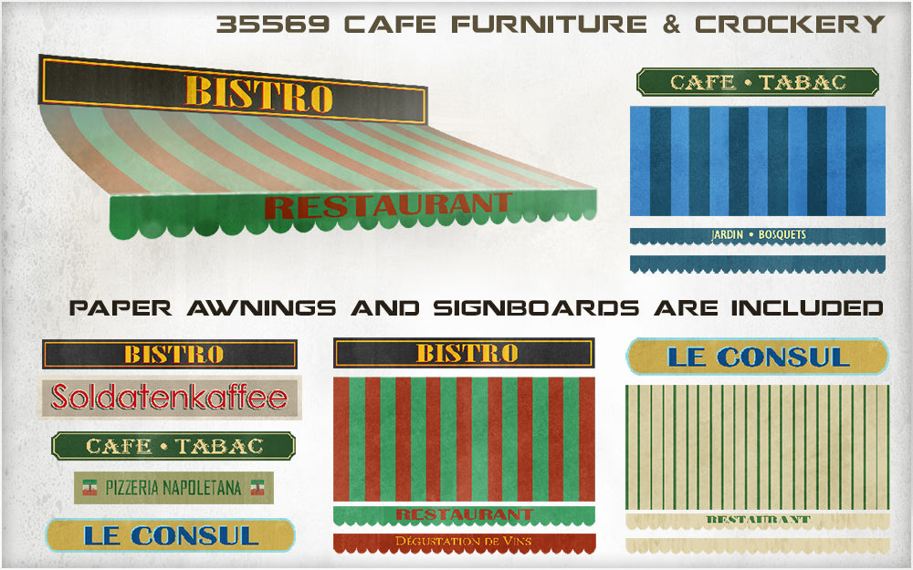 Kit contains unassembled plastic model of Café Furniture & Crockery